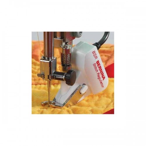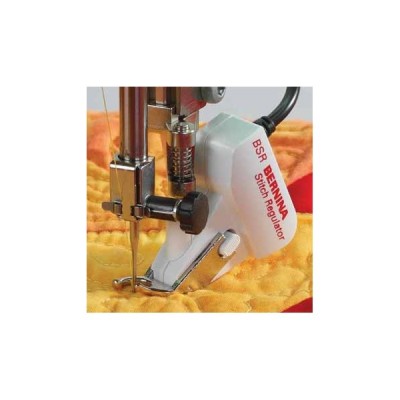 With the aid of technology, the BSR system reads (similar to a wireless mouse) the surface of the fabric under the presser foot. A sensor transfers information to the sewing machine as the material is moved. The sewing machine calculates the necessary sewing speed in order to sew consistent stitches according to the set stitch length.. A slower needle movement and motor speed is required if the material is moved slowly. A faster needle movement and motor speed is needed for faster fabric movement. In The BSR in tandem with the sewing machine, automatically adjusts to the sewer's speed for even and consistent stitching.
